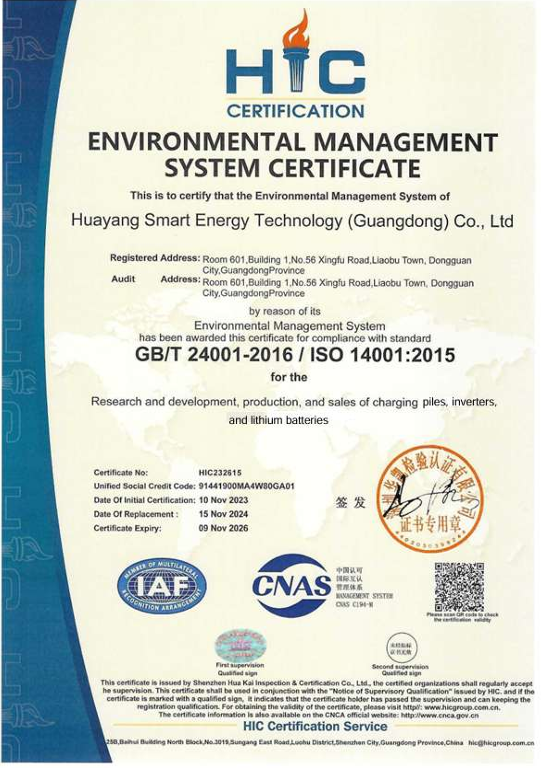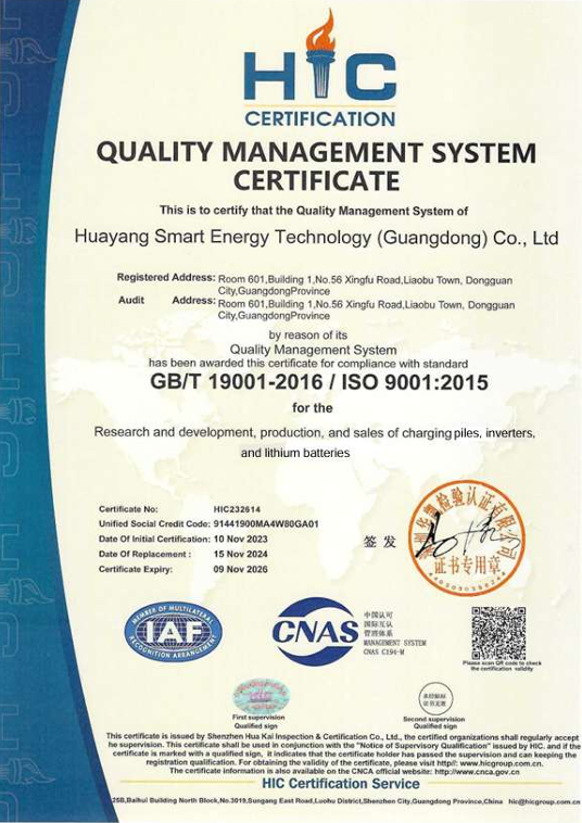 Established in year of 2017, Huayang Smart Energy Technology(Guangdong) Co., Ltd. is a factory engaged in research and development, design, manufacturing, sales and service of EV chargers, Inverters, Lithium Storage Batteries. Our products have three characters: high safety, high efficiency and high stability. Our main products have covered EV Chargers, Inverters, Lithium Storage Batteries, All In One(Inverter + Battery). For EV chargers, the rated power is from 1.5KW to 1200KW. For Inverters, the rated power is from 1.2KW to 60KW. For Lithium Storage Batteries, the nominal capacity is from 0.3KWH to 200KWH. The production standards we are performing include Chinese standard GB, EU standard and US standard.